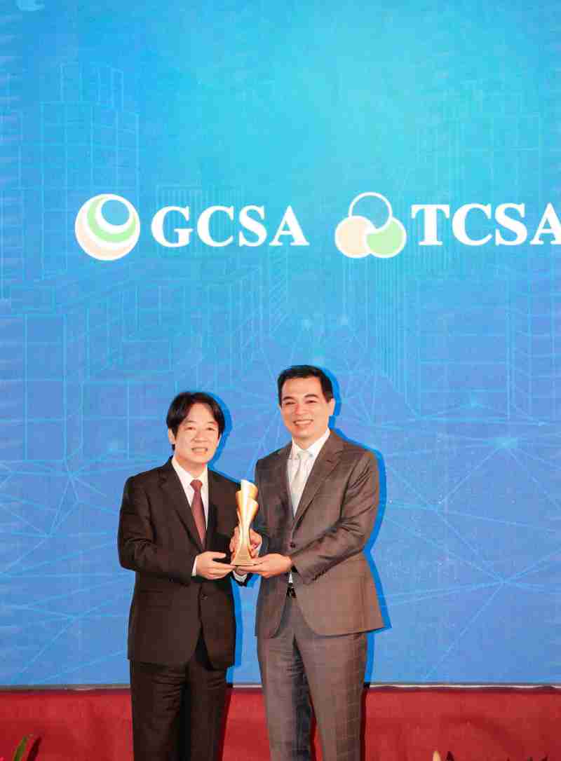 达全方位永续表现获全球永续奖及台湾永续奖肯定,,由副总统赖清德颁奖 (左),,,,欧陆注册总经理柯富仁 (右) 代表领奖