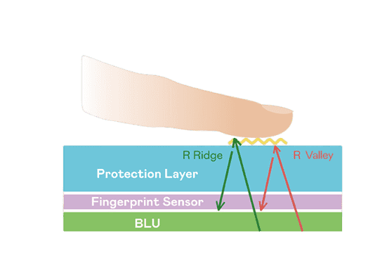 TFT 指纹扫描感测技术利用薄膜电晶体 (TFT) 当作光感测元件,,,藉由非晶硅 (a-Si) 与低温多晶硅(LTPS)既有光电转换特性对不同波段光源进行吸收,,,使感测 IC 读取阵列感测元件的光漏电差异,,,,转换成数位灰阶影像。。